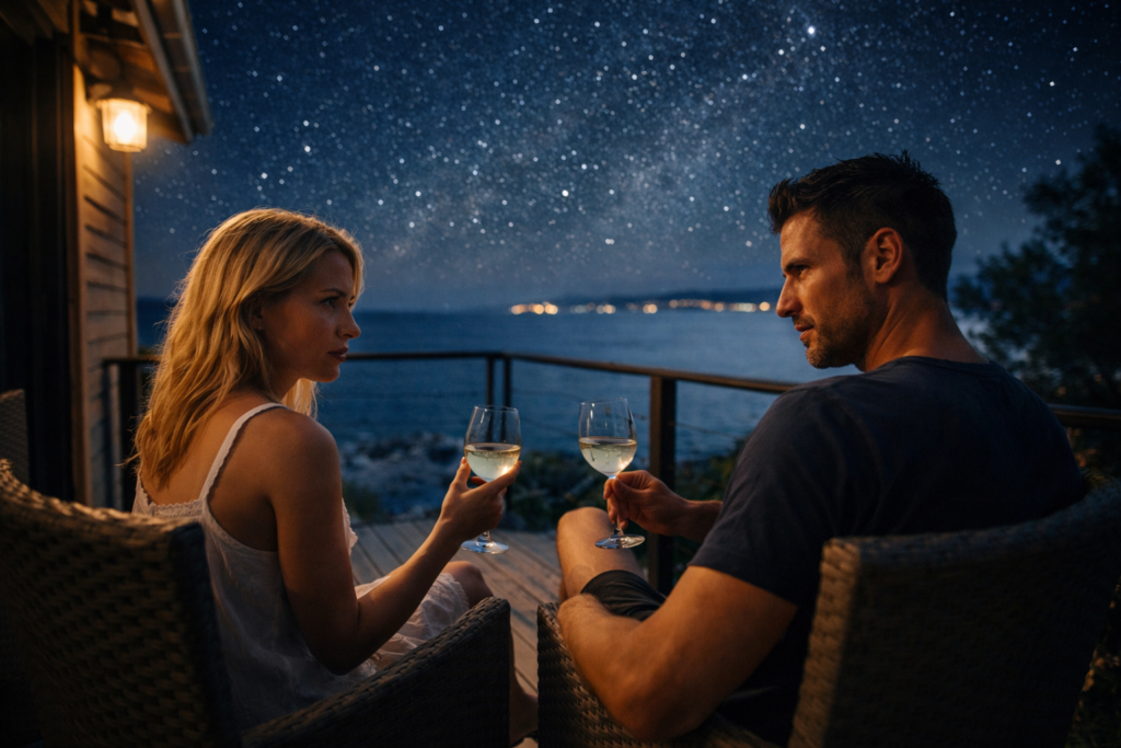 Je choisi donc un soir tranquille, sur notre terrasse de bungalow, face à la méditerranée, armée d’un verre de blanc doux, pour en parler à Sébastien.